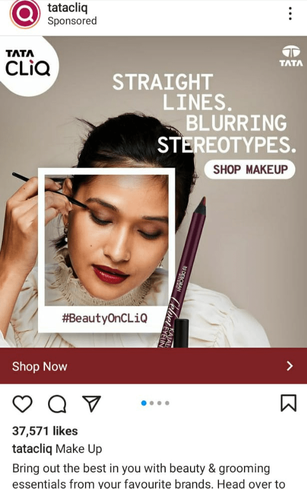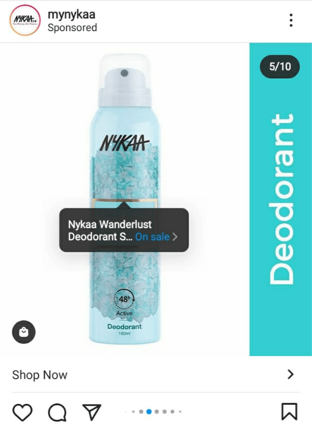 Nykaa is one of the few best online Indian websites which offers amazing products of different brands under one roof. Educating customers regarding the products is its priority. Which makes it different from other. They use appealing color and big fonts so that user can get connected and stop there scrolling and look into the conveying message. They have used refreshing color to showcase the refreshment of deodorant. Therefore, eCommerce industries can leverage this feature of shopping tag in their ads so that user can buy products easily just by tapping on it, without taking a long turn by vising their platform and purchase the product.