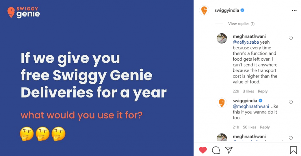 When its comes to engaging with audience, the first thing comes in mind is Swiggy’s social media posts. Whether it is ad or normal Instagram post, they never fail to socialize with their audience in different creative ways. This strategy not only increases the reach, but also create positive brand impression in consumer’s mind.